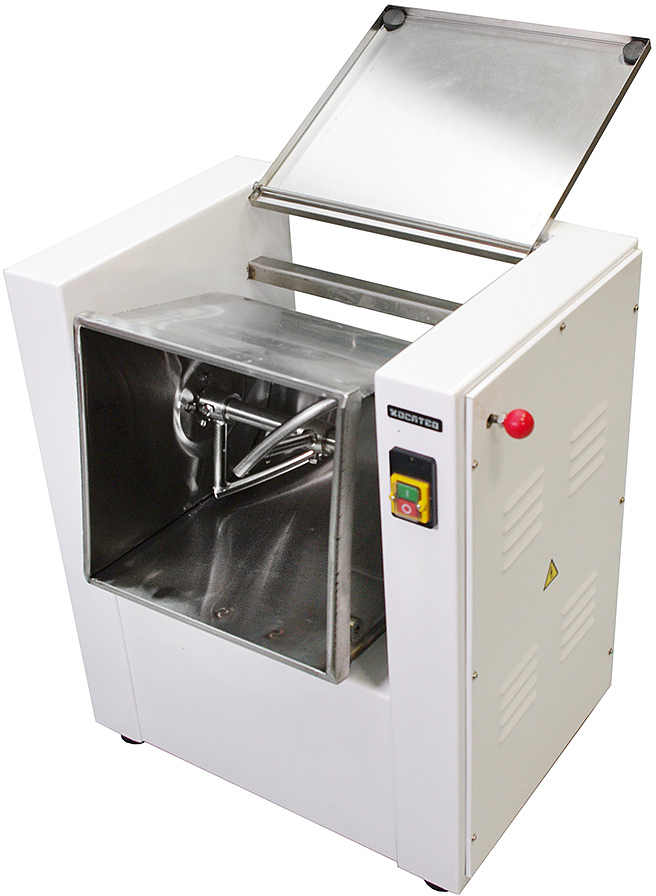 Верхняя откидная крышка позволяет добавлять ингридиенты в процессе замешивания. Большое смотровое окно позволяет наблюдать за процессом. Материал корпуса - эмалированный металл, внутренняя поверхность дежи и мешалка выполнены из нержавеющей стали AISI 304.