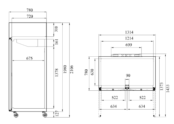 - Глубина с открытыми дверьми: 1373 мм