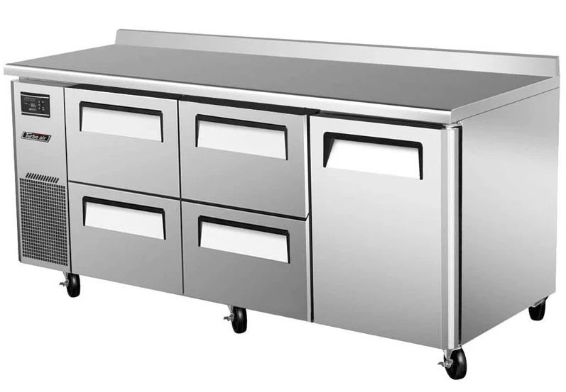 Холодильный стол Turbo air KWR18-2D-4-700 используется для охлаждения, заморозки и длительного хранения пищевых продуктов, а также для обработки ингредиентов на предприятиях общественного питания, торговли и пищевых производствах. Динамическая система охлаждения. Стол установлен на 6 колесах, оснащен дверью, полкой и 4 ящиками. Материал корпуса и направляющих - нержавеющая сталь, материал задней и нижней панелей - гальванизированная сталь, материал пола - нержавеющая сталь с алюминиевыми вставками, материал полок - толстая стальная проволока с виниловым покрытием, материал уплотнения - ABS-пластик.