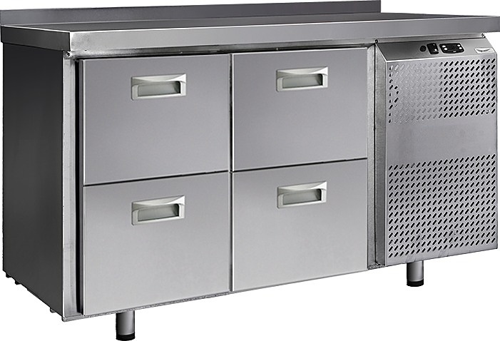Холодильный стол Finist СХС-600-0/4 используется на предприятиях общественного питания, торговли и пищевых производствах для хранения и обработки полуфабрикатов из мяса и рыбы, заготовок для салата, охлажденных напитков и прочих пищевых продуктов. Управление при помощи кнопочной панели управления, оснащенной цифровым дисплеем. 4 выдвижных ящика, агрегатный отсек располагается сбоку. Стол установлен на ножки с подпятниками. Материал корпуса - нержавеющая сталь.