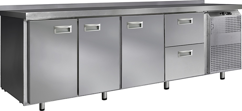 Холодильный стол Finist СХС-600-3/2 используется на предприятиях общественного питания, торговли и пищевых производствах для хранения и обработки полуфабрикатов из мяса и рыбы, заготовок для салата, охлажденных напитков и прочих пищевых продуктов. Управление при помощи кнопочной панели управления, оснащенной цифровым дисплеем. 3 холодильные камеры с распашными дверцами, 2 выдвижных ящика, агрегатный отсек располагается сбоку. Стол установлен на ножки с подпятниками. Материал корпуса - нержавеющая сталь.