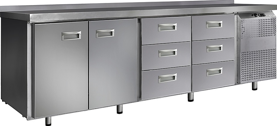 Холодильный стол Finist СХС-700-2/6 используется на предприятиях общественного питания, торговли и пищевых производствах для хранения и обработки полуфабрикатов из мяса и рыбы, заготовок для салата, охлажденных напитков и прочих пищевых продуктов. Управление при помощи кнопочной панели управления, оснащенной цифровым дисплеем. 2 холодильные камеры с распашными дверцами, 6 выдвижных ящиков, агрегатный отсек располагается сбоку. Стол установлен на ножки с подпятниками. Материал корпуса - нержавеющая сталь.