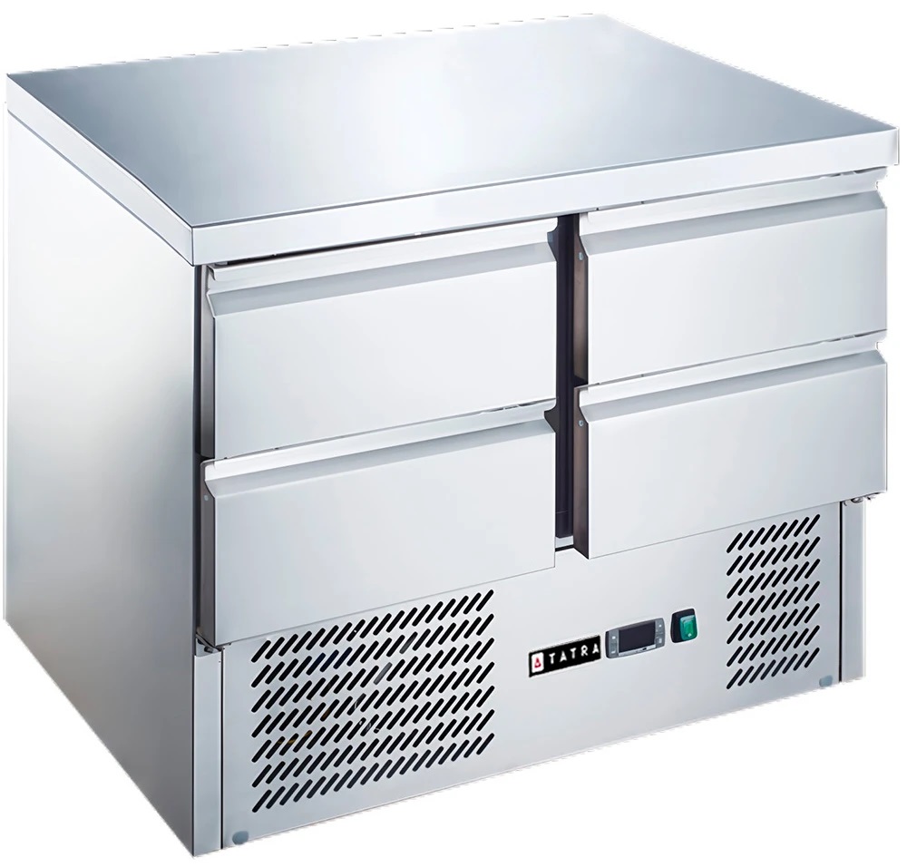 Холодильный стол Tatra TRTGNLD4 TN используется на предприятиях общественного питания, торговли и пищевых производствах для охлаждения и кратковременного хранения различных блюд, напитков и продуктов, а также для раскатки теста и обработки ингредиентов. Модель оснащена 4 ящиками и цифровым термостатом. Материал корпуса и столешницы - нержавеющая сталь, теплоизоляция выполнена из полиуретана.