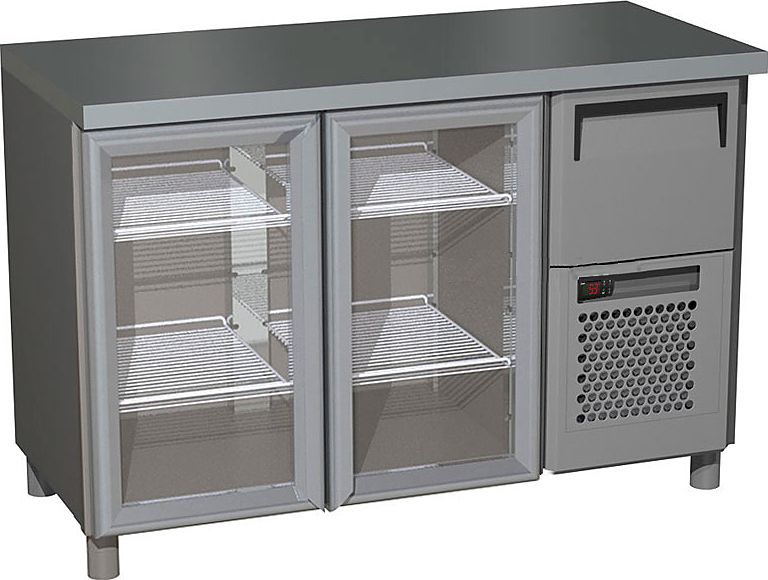 Холодильный стол Carboma T57 M2-1-G 0430 (BAR-250С) предназначен для раскатки теста, обработки ингредиентов для приготовления блюд, охлаждения и кратковременного хранения скоропортящихся продуктов и напитков на предприятиях общественного питания и торговли. Модель оснащена охлаждаемым ящиком и регулируемыми ножками высотой от 90 до 110 мм. Цельнозаливной корпус выполнен из нержавеющей стали, дверцы - из стекла.