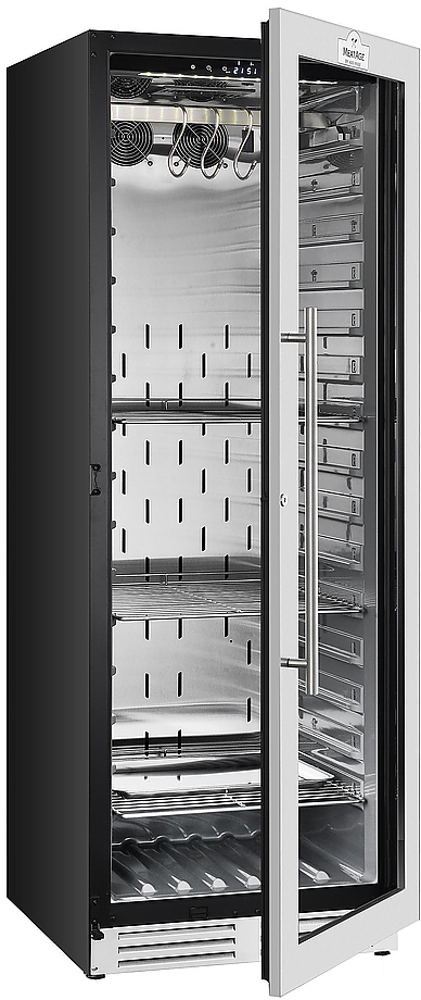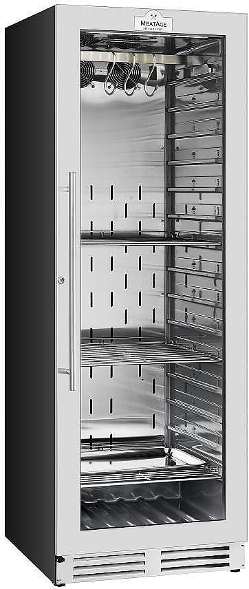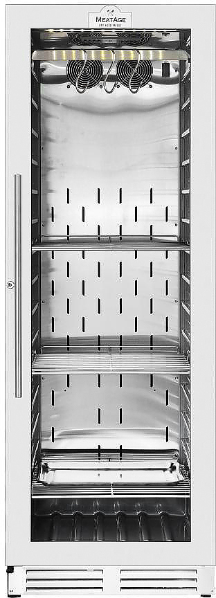 Шкаф для мяса MeatAge VI120 используется для охлаждения, хранения и вызревания мяса, ветчины и салями на предприятиях общественного питания, торговли, пищевых производствах и в домашних условиях. Модель оснащена акустической сигнализацией, LED подсветкой и замком. Материал двери - ударопрочное стекло, материал корпуса и комплектующих - высококачественная нержавеющая сталь AISI 304,