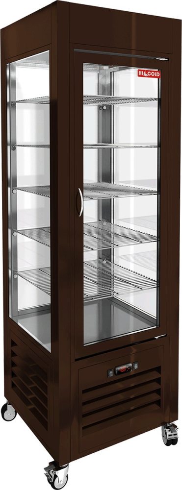 Кондитерская витрина HICOLD VRC 350 Brown используется на предприятиях общественного питания и торговли для демонстрации, охлаждения и кратковременного хранения кондитерских изделий и десертов. Модель оснащена 5 полками, светодиодной подсветкой и колесами со стопорами. Корпус выполнен из окрашенной стали.