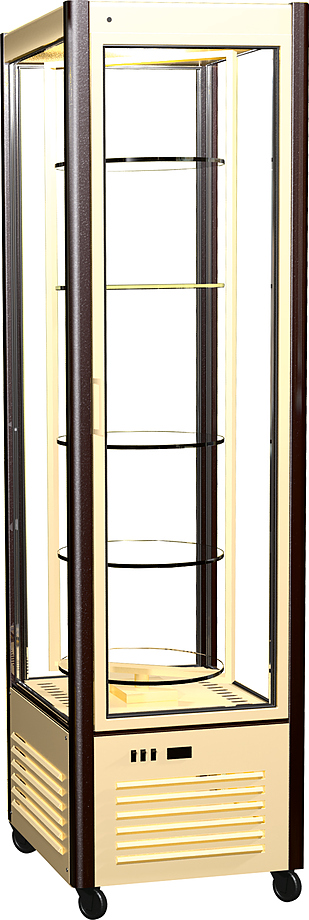 Вентилируемая кондитерская шкаф-витрина KAYMAN К-ШВ-400В предназначена для охлаждения, кратковременного хранения и демонстрации выпечки, тортов, пирожных и пиццы на предприятиях общественного питания и торговли. Модель оснащена 4 круглыми вращающимися полками и тепло-белой LED-подсветкой по 2 боковым стойкам.