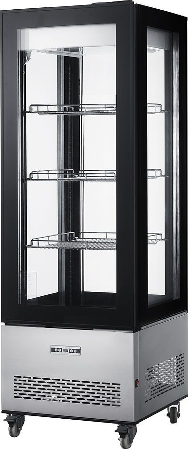 Холодильная витрина Enigma RT-400L предназначена для демонстрации, кратковременного хранения и охлаждения упакованных свежих продуктов, кондитерских изделий и десертов на предприятиях общественного питания и торговли. Модель оснащена электронным управлением с дисплеем и распашной дверью. База выполнена из нержавеющей стали, корпус выкрашен в черный цвет.