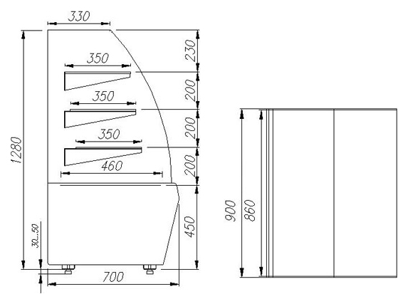 Кондитерская витрина Carboma K70 VV 0,9-1 (ВХСв - 0,9д Люкс Техно) используется на предприятиях общественного питания и торговли для демонстрации, охлаждения и кратковременного хранения тортов, пирожных и других кондитерских изделий. Модель оснащена изогнутым стеклопакетом с раздвижными задними створками на роликах, 3 охлаждаемыми фиксированными полками и регулируемыми ножками высотой от 30 до 50 мм. Основание и декоративные панели выполнены из стали, боковины - из металла.