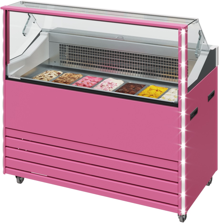 Витрина для мороженого Carboma IC72 SL 1,3-1 9003 предназначается для предпродажной демонстрации, охлаждения и хранения мороженого. Модель оснащена системой автоматической разморозки, технологией одноконтурной морозильной цепи из 2 элементов и технологией нагрева фронтального стеклопакета, позволяющей избегать запотевание стекла. Встроенные ручки, поворотно-откидная створка и колесики для перемещения. Материал столешницы - нержавеющая сталь, материал передней панели - крашеная сталь, створка из плексигласа, теплоизоляция корпуса - пенополиуретан.
