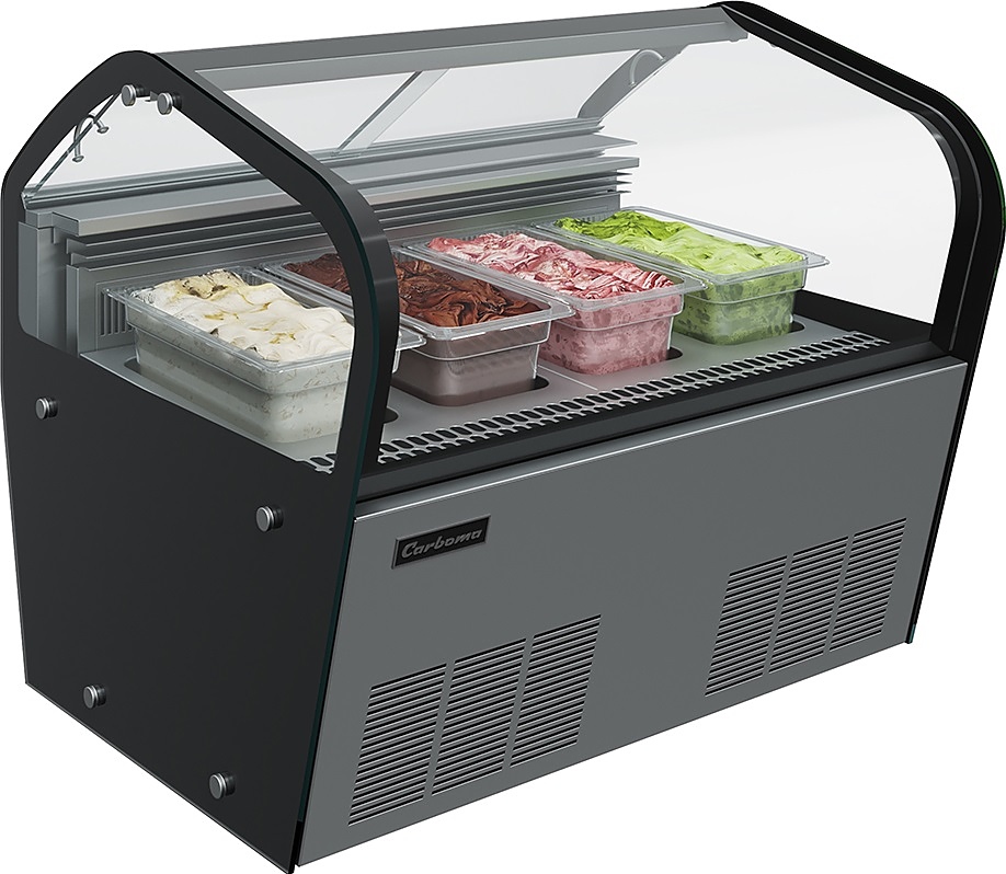 Витрина для мороженого Carboma I60 VL 0,8-1 JOY предназначается для охлаждения, хранения и демонстрации мороженого на предприятиях общественного питания и торговли. Управление при помощи электронного блока Carel, динамическая система охлаждения. Витрина оснащена прозрачным изогнутым фронтальным стеклом и 2 боковыми стеклопакетами. Опоры регулируются по высоте. Материал каркаса - сталь с антикоррозийным покрытием, материал фронтальной панели - сталь с темно-серым покрытием, материал экспозиционных поддонов - нержавеющая сталь, материал гастроемкостей - прозрачный поликарбонат, материал термоизоляции - пенополиуретан.