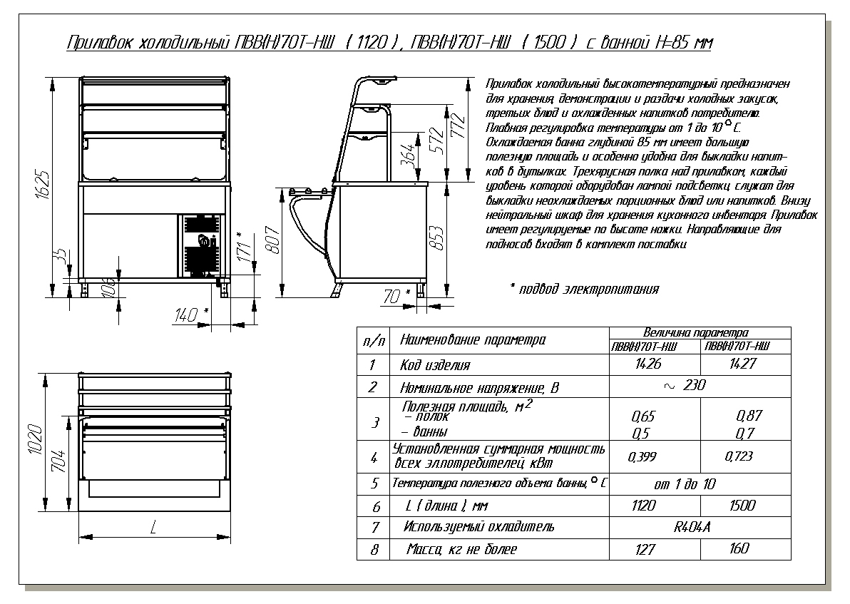 Прилавок-витрина Abat ПВВ(Н)-70Т-01-НШ предназначен для демонстрации, охлаждения, кратковременного хранения блюд, холодных закусок и напитков в составе линий раздач на предприятиях общественного питания и торговли. Модель оснащена регулируемыми по высоте ножками.