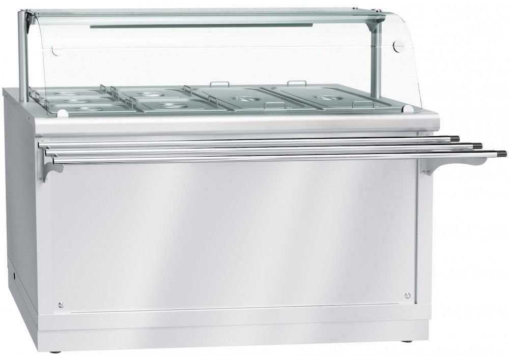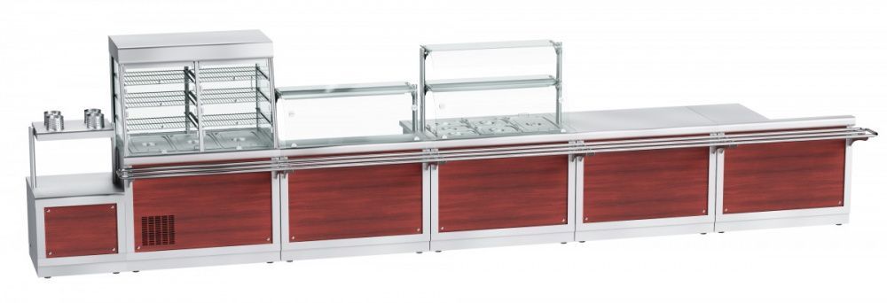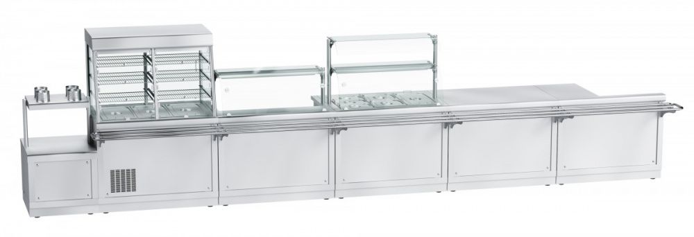 В комплект поставки входят 2 гастроемкости GN 1/1 глубиной 150 мм, 2 гастроемкости GN 1/2 глубиной 150 мм, 3 гастроемкости GN 1/3 глубиной 150 мм и направляющая для подносов.