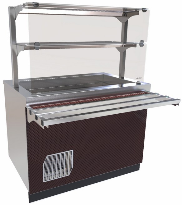 Прилавок-витрина Abat ПВВ(Н)-70Е-02-НШ используется для демонстрационной выкладки, охлаждения, кратковременного хранения закусок, третьих блюд и напитков в составе линий раздач на предприятиях общественного питания, торговли и пищевых производствах. Модель со светодиодной подсветкой, 2 полками, нейтральным шкафом для хранения кухонного инвентаря и регулируемыми по высоте ножками.