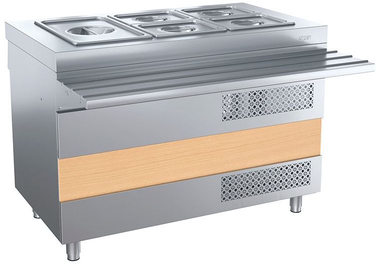 Охлаждаемый стол ATESY Ривьера ОС-1200-02-О используется на предприятиях общественного питания и торговли для кратковременного хранения и раздачи холодных напитков, салатов, кисломолочных продуктов и других блюд, требующих хранения в охлажденном состоянии. Модель оснащена герметичной ванной для размещения гастроемкостей или напитков и продуктов в фабричной упаковке, а также тарелок с уже сервированными блюдами непосредственно на дне ванны. Столешница выполнена из нержавеющей стали AISI 430 и усилена листом ламинированной ДСП толщиной 16 мм, ванна - из нержавеющей стали, ножки - из нержавеющей стали и пластиковой опорной части.