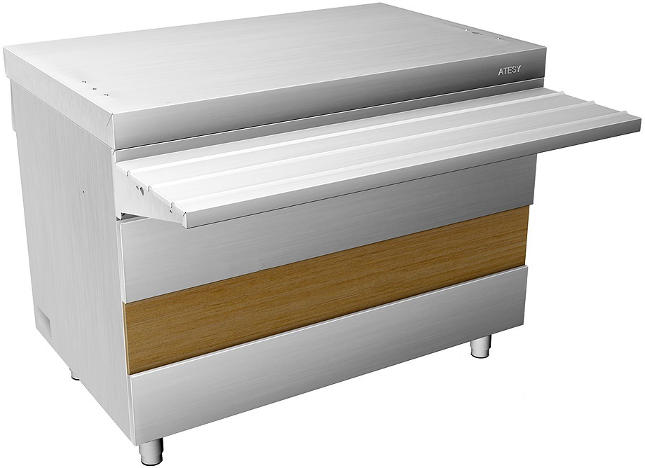 Прилавок для горячих напитков ATESY Ривьера НС-1500-02-О используется на предприятиях общественного питания, торговли и пищевых производствах для обработки и выкладки пищевых продуктов и напитков. Материал рабочей поверхности – нержавеющая сталь AISI 430 усилена листом ЛДСП (толщина 16 мм), конструкция - разборная.