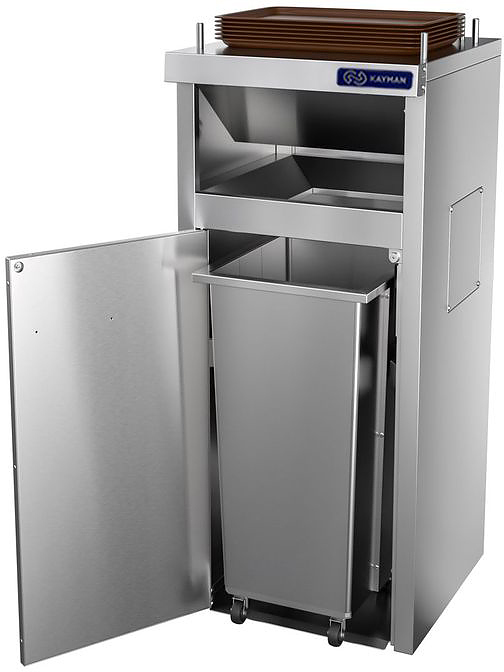 Станция KAYMAN СО-98-С Аиспользуется на предприятиях общественного питания, торговли и пищевых производствах для сбора, сортировки и временного хранения пищевых отходов, одноразовой посуды и упаковочной бумаги от продуктов. Модель оснащена полкой для хранения подносов и выкатной мусорной емкостью. Материал тумбы и емкости - высококачественная нержавеющая сталь.