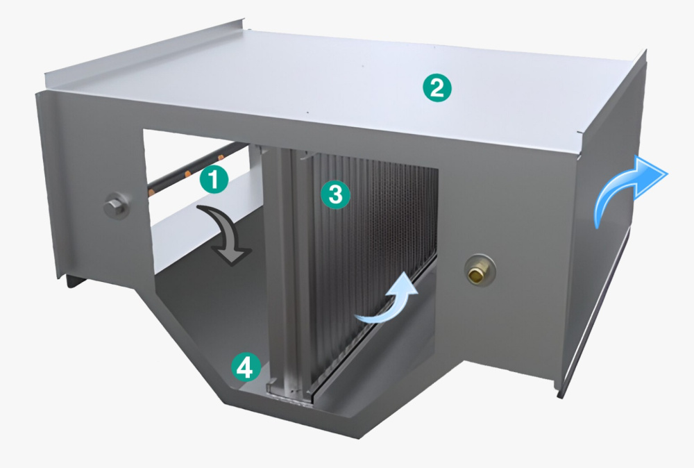 - Дымовые газы проходят через распылительные форсунки и лабиринтную кассету для охлаждения и очистки