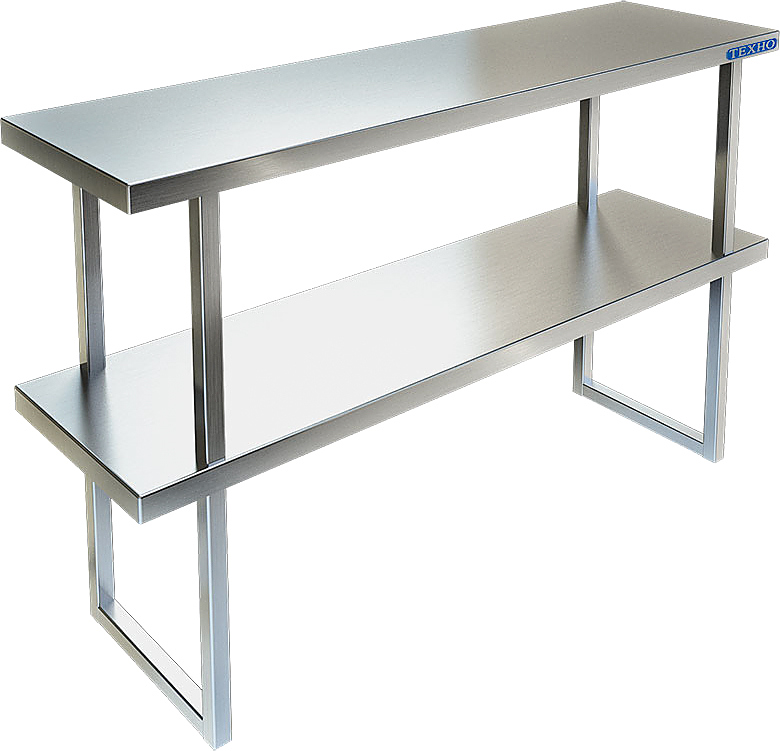 Кухонная двухъярусная полка Техно-ТТ ПН-821/603 предназначена для хранения посуды, различного инвентаря и сухих продуктов на предприятиях общественного питания, торговли и пищевых производствах. Изделие крепится к столешнице при помощи болтов через отверстия в боковинах. Материал разборного каркаса - нержавеющая сталь AISI 304, боковины выполнены из трубы 20x20 мм.