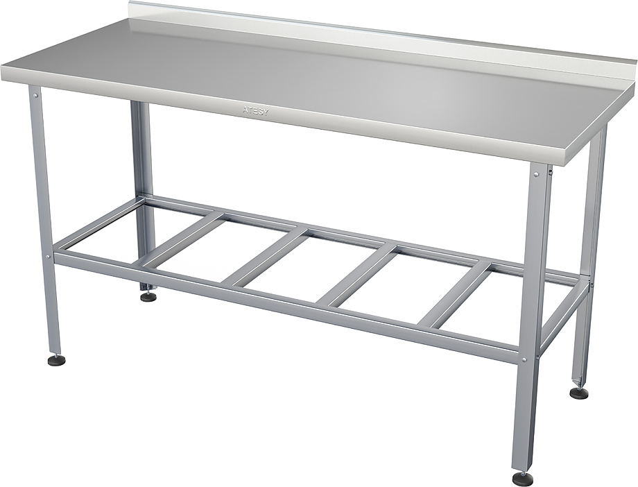 Производственный стол ATESY СР-С-1-1200.600-02 серии Стандарт предназначен для раскатки теста и обработки ингредиентов на предприятиях общественного питания и торговли. Полка-решетка и каркас выполнены из оцинкованной стали толщиной 1,2 мм, столешница - из нержавеющей стали AISI 430 толщиной 0,8 мм, ножки - из нержавеющей стали, опора ножек - из пластика.