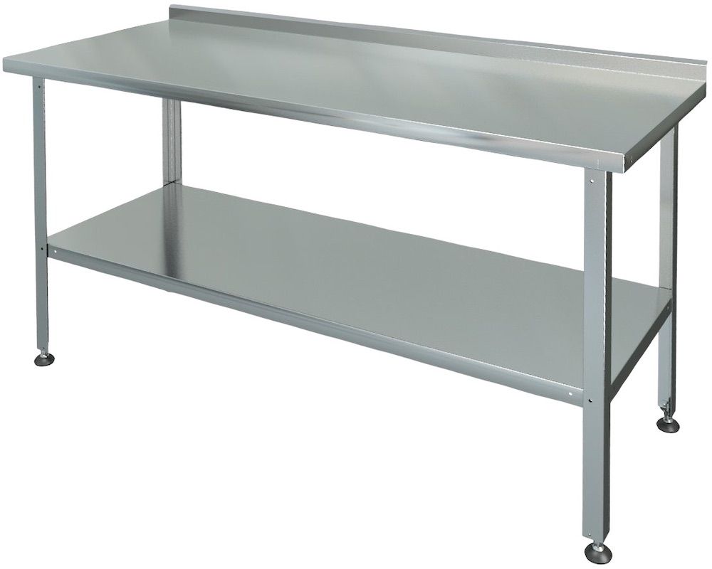 Столешница стола, усиленная подложкой из ЛДСП толщиной 15 мм,выполнена из нержавеющей стали AISI 430 толщиной 0,5 мм, каркас - из оцинкованного уголка толщиной 1+1 мм, ножки с регулиремыми опорами - из оцинкованного стального уголка 40х40 мм с подгибом краёв во внутрь толщиной 1,0 мм. Изделие оснащено практичной сплошной полкой из нержавеющей стали и одним бортом.