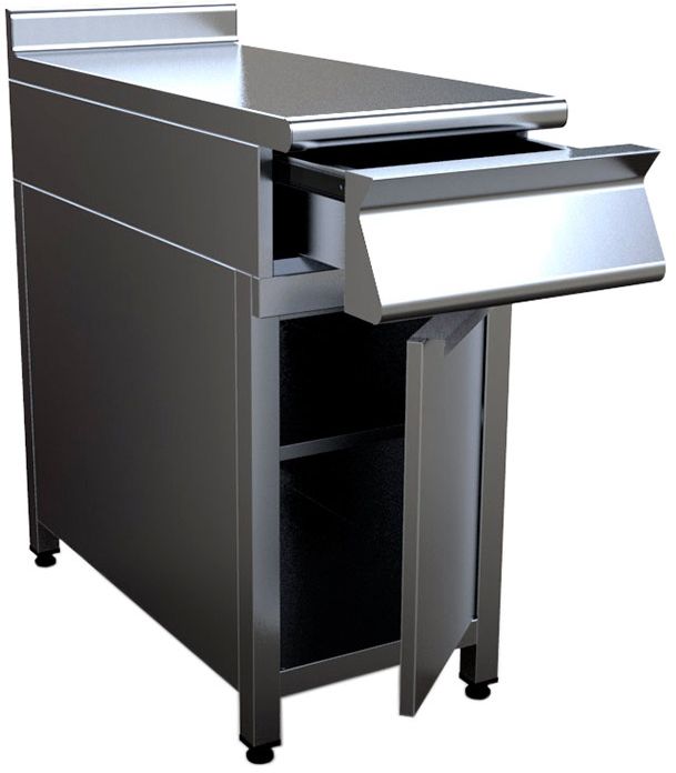 Закрытый нейтральный модуль Кобор N9-5EB предназначен для использования в составе тепловой линии в качестве дополнительного места для раскатки теста, обработки ингредиентов для приготовления блюд, установки оборудования и приборов. Модуль оснащен выдвижным ящиком, сплошной полкой, распашной дверцей и регулируемыми по высоте ножками. Корпус выполнен из нержавеющей стали AISI 430, каркас - из профильной трубы 40х40 мм.