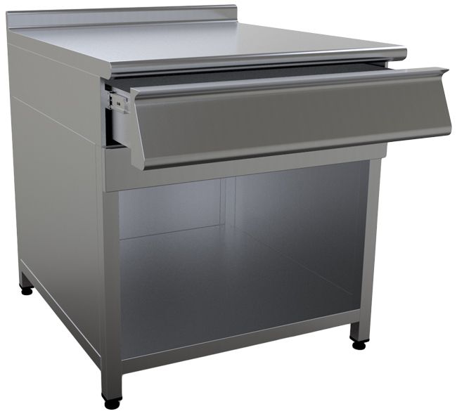 Полузакрытый нейтральный модуль Кобор N9-7CB предназначен для использования в составе тепловой линии в качестве дополнительного места для раскатки теста, обработки ингредиентов для приготовления блюд, установки оборудования и приборов, хранения продуктов, не требующих специального температурного режима, посуды и кухонных принадлежностей. Модуль оснащен выдвижным ящиком, сплошной полкой и регулируемыми по высоте ножками. Корпус выполнен из нержавеющей стали AISI 430, каркас - из профильной трубы 40х40 мм.