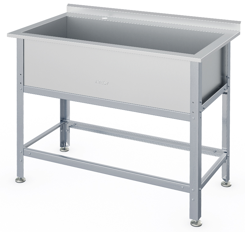 Моечная ванна ATESY ВСМ-Б-1.1110.530-1-02 серии Бюджет используется на предприятиях общественного питания и торговли для мытья столовой и кухонной посуды, инвентаря, овощей и фруктов, а также для оттайки замороженных пищевых продуктов. Каркас выполнен из профиля из оцинкованной стали толщиной 1,2 мм, ванны - из нержавеющей стали AISI 430 толщиной 0,7 мм, опорная ножка - из пластика, опоры регуляторов высоты ножек - из нержавеющей стали.