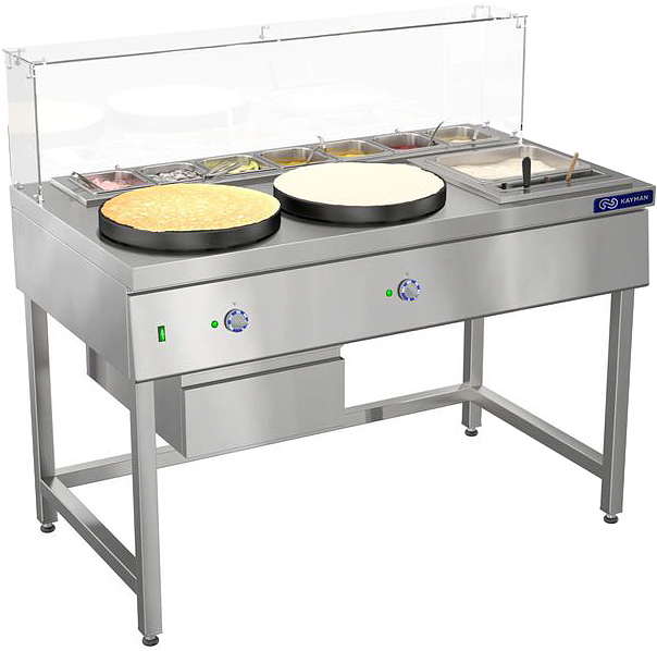 Блинная станция KAYMAN СП-Б-1350 А используется на предприятиях общественного питания и торговли для комплексного оснащения места для приготовления и раздачи блинов с начинкой. Двухконфорочный электрический блинный аппарат и съемные гастронормированные холдеры для размещения емкостей с тестом и начинками. Материал корпуса - сталь с антикоррозийным покрытием, материал каркаса - нержавеющая труба (40x40 мм), материал конфорки - чугун.
