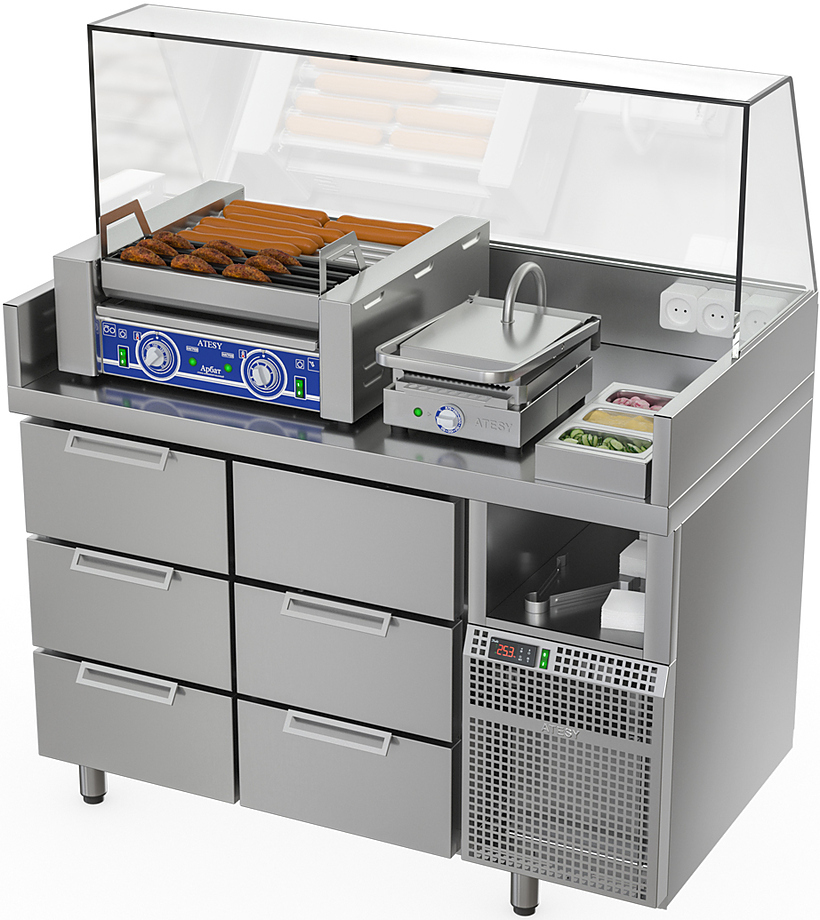 Станция для бургеров и хот-догов ATESY Бавария БХС-1235.700-02-1 используется на предприятиях общественного питания, торговли и пищевых для производствах с целью комплексного оснащения места для приготовления и продажи хот-догов и бургеров, а также хранения охлажденных полуфабрикатов, начинок, соусов и хлебобулочных изделий. Нейтральная ниша для хранения инвентаря и посуды, охлаждаемые гастронормированные ящики (GN 1/1, максимально допустимая глубина устанавливаемых гастроемкостей - 150 мм), температурный режим станции регулируется с помощью встроенного контроллера (есть возможность программирования). Материал станции - нержавеющая сталь.