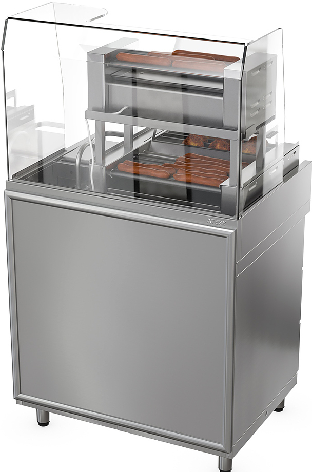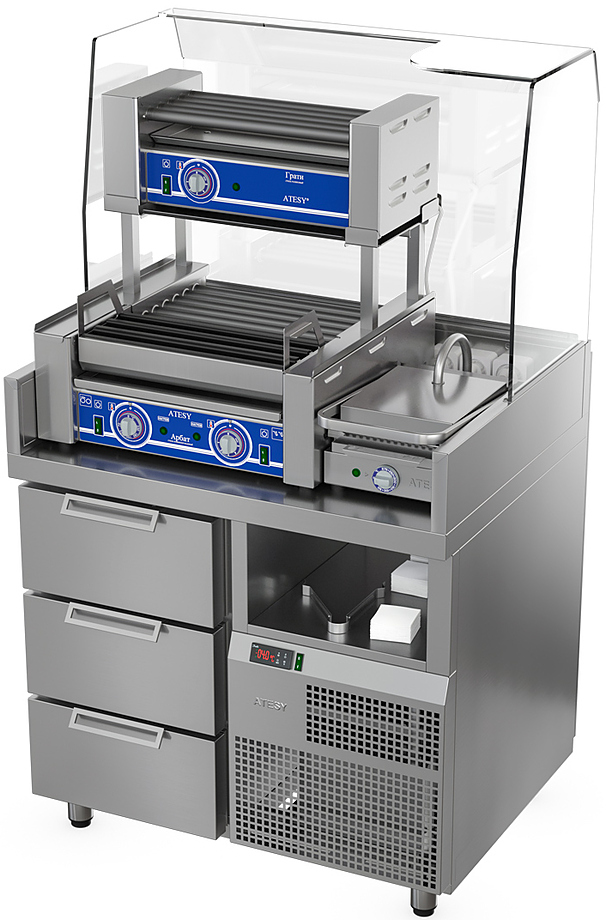 Станция для бургеров и хот-догов ATESY Бавария БХС-900.700-02 плюс используется на предприятиях общественного питания, торговли и пищевых для производствах с целью комплексного оснащения места для приготовления и продажи хот-догов и бургеров, а также хранения охлажденных полуфабрикатов, начинок, соусов и хлебобулочных изделий. Нейтральная ниша для хранения инвентаря и посуды, охлаждаемые гастронормированные ящики (GN 1/1, максимально допустимая глубина устанавливаемых гастроемкостей - 150 мм), температурный режим станции регулируется с помощью встроенного контроллера (есть возможность программирования). Рабочее пространство столешницы предусматривает установку комби-гриля “АРБАТ” КГ-7, гриля контактного “МАЭСТРО” ГК-1, роликового гриля "ГРАТИ-5" (поставляются отдельно). Материал станции - нержавеющая сталь.