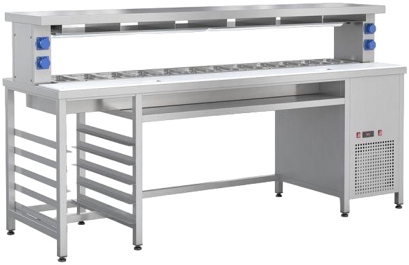 Станция RoboLabs СФ-240Н используется на предприятиях общественного питания, торговли и пищевых для производствах с целью комплексного оснащения места для приготовления и продажи бургеров. Модель оснащена охлаждаемой ванной на 12 гастроемкостей, рабочей зоной, направляющими, полкой и подсветкой. Материал станции - высококачественная нержавеющая сталь.