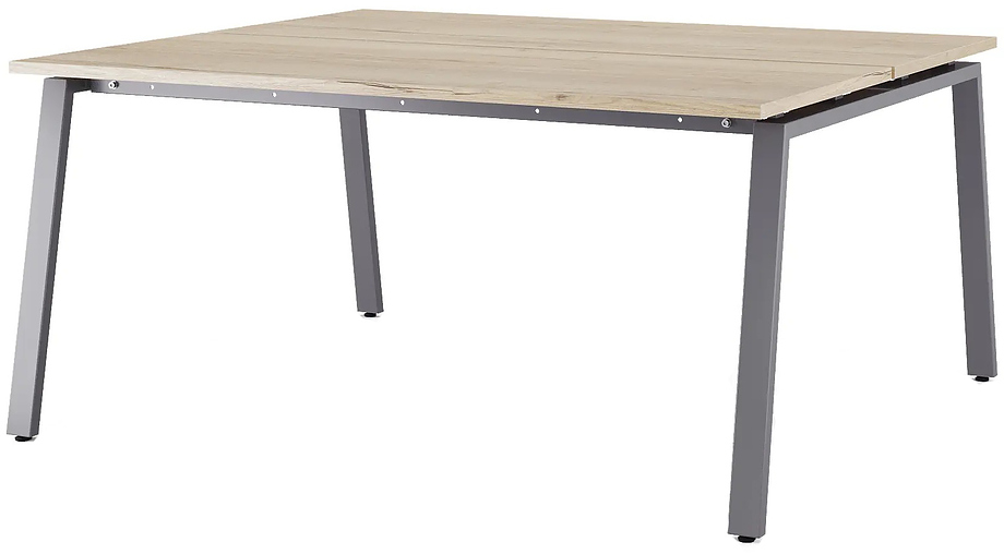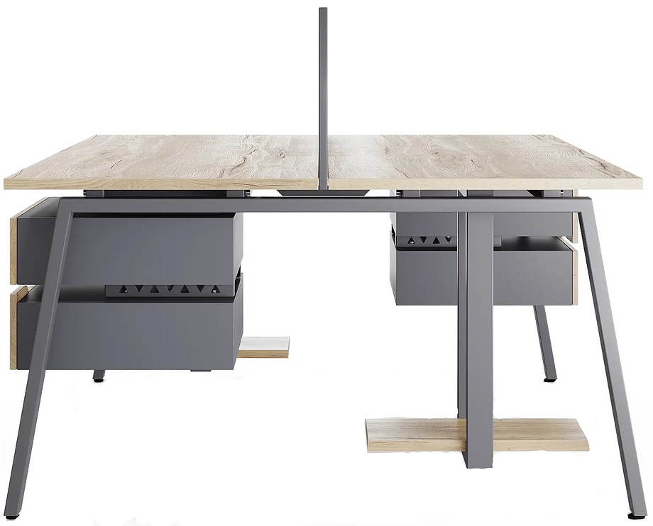 Офисный стол Кобор A/2-140/140 graphite/natural предназначен для двух рабочих мест и идеально подходит для офисов и кабинетов руководителей. Модель оснащена А-образными опорами. Материал столешницы - прочный ЛДСП толщиной 25 мм, усиленная снизу металлическим каркасом, материал опор и каркаса - окрашенный металл.