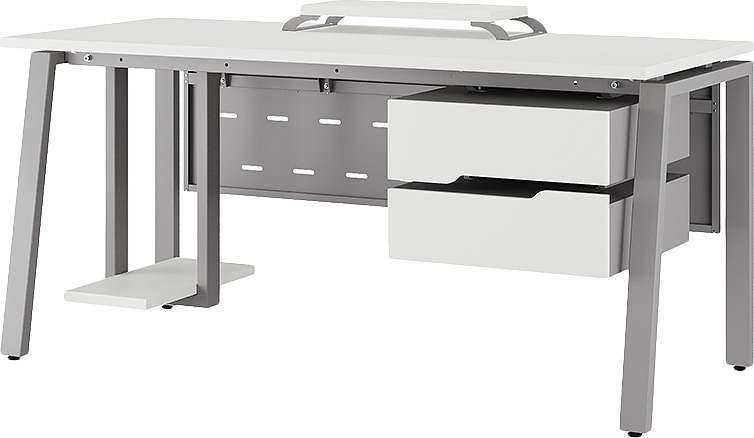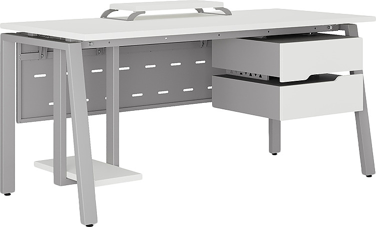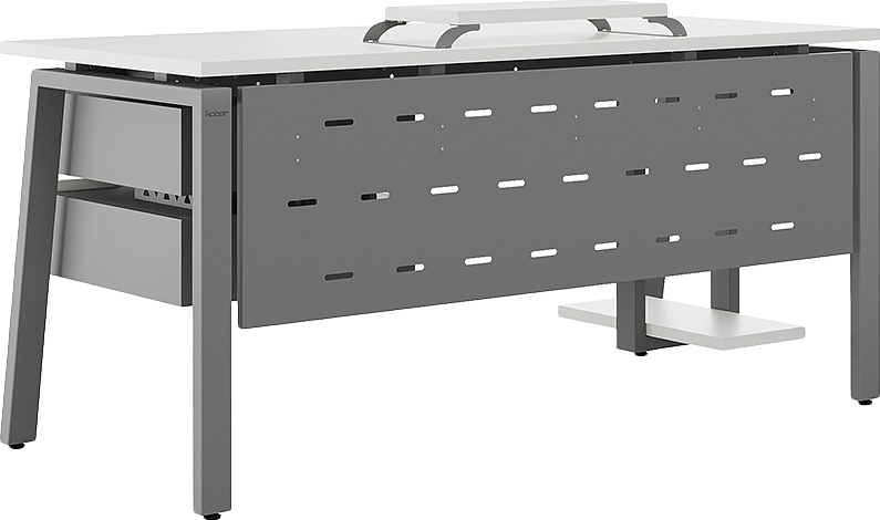 Офисный стол КОБОР AB-120/60 aluminum/premium используется в офисных помещениях и кабинетах руководителей. Модель оснащена A-образными опорами со скошенными фронтальными сегментами. Материал столешницы - прочный ЛДСП толщиной 25 мм, усиленная снизу металлическим каркасом, материал опор и каркаса - окрашенный металл.