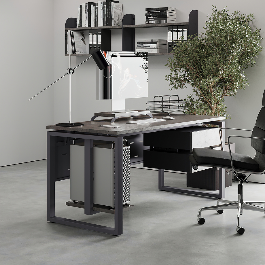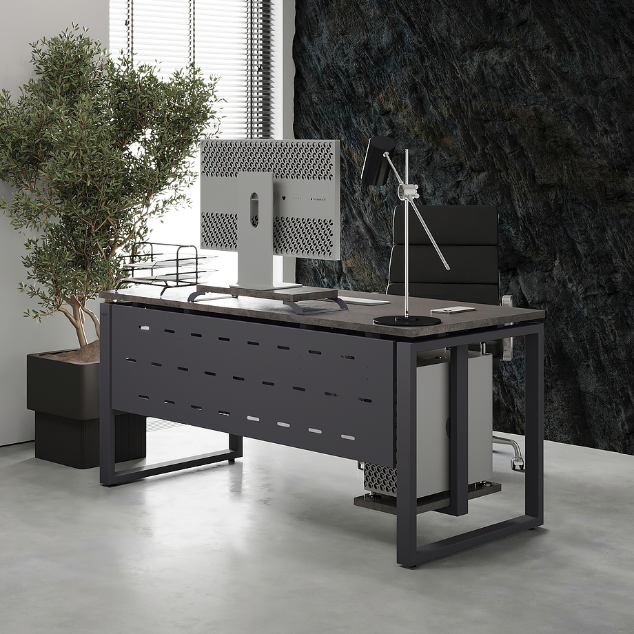 Офисный стол КОБОР O1-140/70 graphite/chicago используется в офисных помещениях и кабинетах руководителей. Модель оснащена О-образными опорами. Материал столешницы - прочный ЛДСП толщиной 25 мм, усиленная снизу металлическим каркасом, материал опор - окрашенный металл.