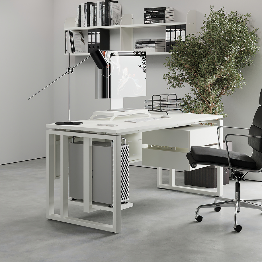 Офисный стол КОБОР O2-140/70 white/premium используется в офисных помещениях и кабинетах руководителей. Модель оснащена О-образными опорами и усиленной вертикальной балкой. Материал столешницы - прочный ЛДСП толщиной 25 мм, усиленная снизу металлическим каркасом, материал опор - окрашенный металл.