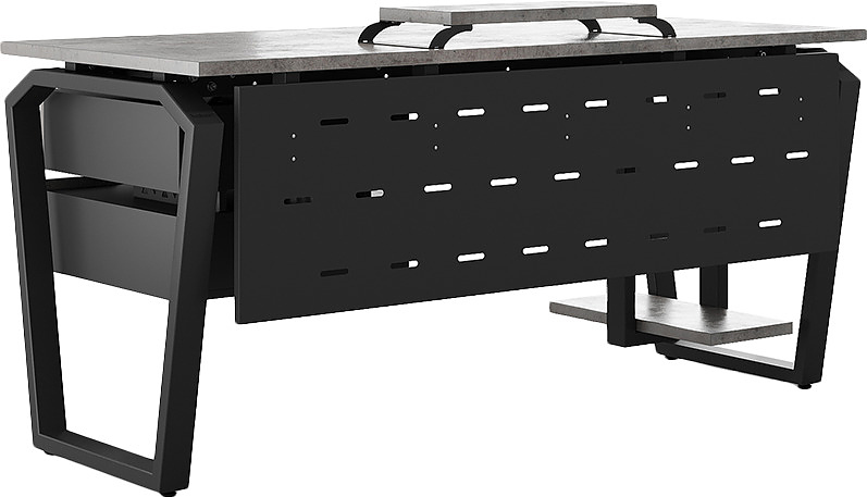 Офисный стол КОБОР TB-120/60 black/chicago используется в офисных помещениях и кабинетах руководителей. Конструкция модели включает опоры, выполненные в виде перевернутой трапеции со скошенными верхними углами. Материал столешницы - прочный ЛДСП толщиной 25 мм, усиленная снизу металлическим каркасом, материал опор - окрашенный металл.