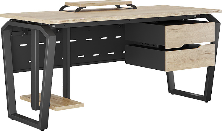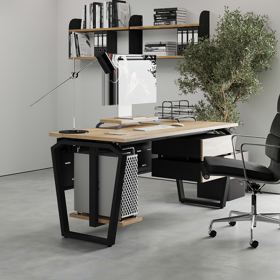 Офисный стол КОБОР TB-140/70 black/natural используется в офисных помещениях и кабинетах руководителей. Конструкция модели включает опоры, выполненные в виде перевернутой трапеции со скошенными верхними углами. Материал столешницы - прочный ЛДСП толщиной 25 мм, усиленная снизу металлическим каркасом, материал опор - окрашенный металл.