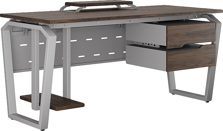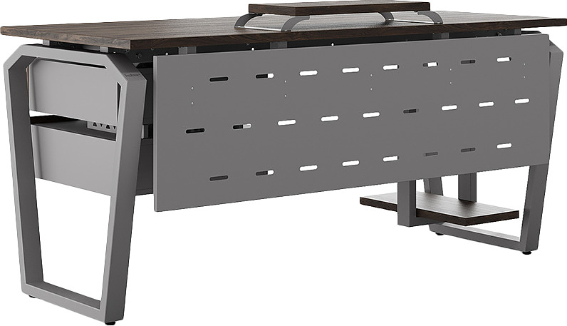 Офисный стол КОБОР TB-140/70 aluminum/charlston используется в офисных помещениях и кабинетах руководителей. Конструкция модели включает опоры, выполненные в виде перевернутой трапеции со скошенными верхними углами. Материал столешницы - прочный ЛДСП толщиной 25 мм, усиленная снизу металлическим каркасом, материал опор - окрашенный металл.