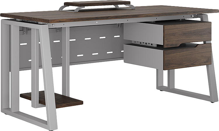 Офисный стол КОБОР TS2-120/60 aluminum/charlston используется в офисных помещениях и кабинетах руководителей. Модель оснащена опорами в форме наклонной трапеции с усиленными вертикальными балками. Материал столешницы - прочный ЛДСП толщиной 25 мм, усиленная снизу металлическим каркасом, материал опор - окрашенный металл.