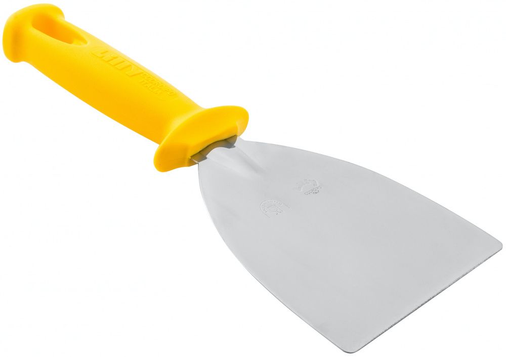Скребок LILLY CODROIPO 162/10 используется на предприятиях общественного питания и торговли для разделения теста на нужные по размеру куски. Модель оснащена широким основанием и ручкой. Скребок изготовлен из нержавеющей стали, рукоятка - из желтого термостойкого пластика.