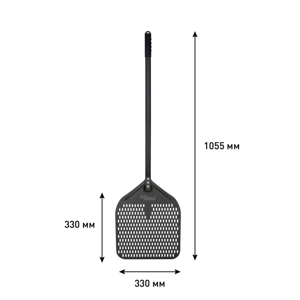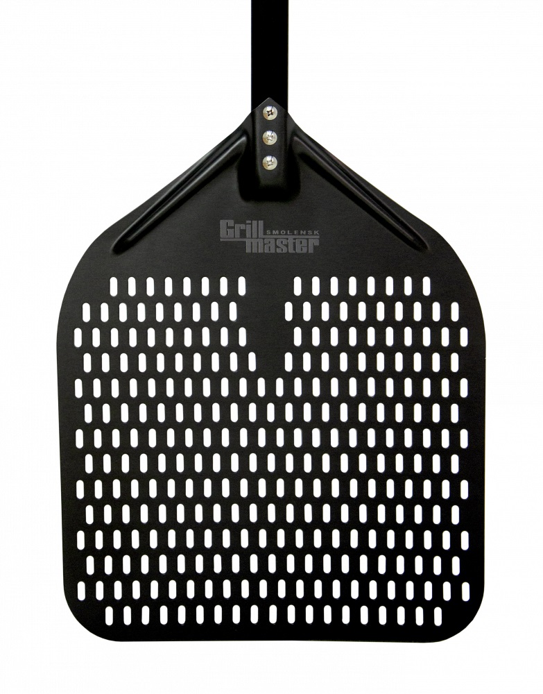Лопата Grill Master 330-M используется для загрузки, выгрузки и поворачивания пиццы и других хлебобулочных изделий в процессе приготовления на предприятиях общественного питания, торговли, пищевых производствах и в домашних условиях. Модель оснащена перфорацией и удобной ручкой с резиновым наконечником. Кромка лопаты со снятой фаской. Материал изделия - анодированный алюминий черного цвета толщиной 1.5 мм.