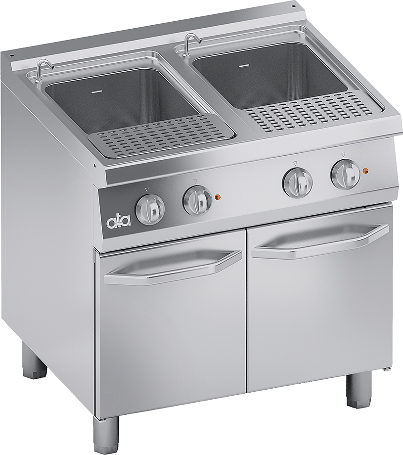 Макароноварка ATA K7ECPP10 предназначается для варки макаронных изделий всех видов, пельменей, вареников, корнеплодов и прочих продуктов, приготовления гарниров из круп на предприятиях общественного питания, торговли и пищевых производствах. Электромеханическая панель управления, ручной предохранительный термостат и регулируемые по высоте ножки. Материал корпуса и ножек - высококачественная нержавеющая сталь, материал формованного резервуара - нержавеющая сталь AISI 316, материал рабочей поверхности - нержавеющая сталь AISI 304, материал атермических ручек - пластик с трафаретной печатью по краям.