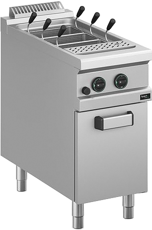 Макароноварка Apach APPG-49P/PL 900-й серии используется на предприятиях общественного питания и торговли для приготовления спагетти, пасты и прочих изделий из теста. Модель оснащена закрытым шкафом с распашной дверцей, электромеханической панелью управления с терморегулятором и таймером и горелками с пьезоэлектрическим поджигом и системой стабилизации пламени. Корпус, рабочая поверхность, панель управления и вытяжная решетка выполнены из нержавеющей стали AISI 304, дверца, боковые и задние панели - из нержавеющей стали AISI 430, ванна - из нержавеющей стали AISI 316.