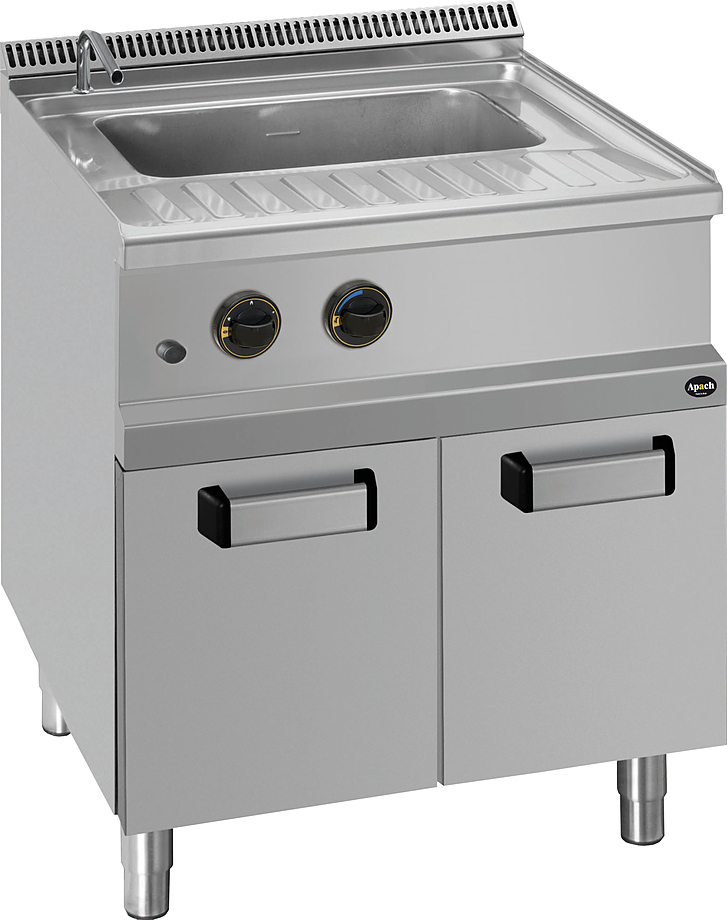 Макароноварка Apach APPG-77P/PL 700-й серии используется на предприятиях общественного питания и торговли для приготовления спагетти, пасты и прочих изделий из теста. Модель оснащена закрытым шкафом с 2 распашными дверцами, электромеханической панелью управления с терморегулятором и таймером и горелками с пьезоэлектрическим поджигом и системой стабилизации пламени. Корпус, рабочая поверхность, панель управления и вытяжная решетка выполнены из нержавеющей стали AISI 304, дверцы, боковые и задние панели - из нержавеющей стали AISI 430, ванна - из нержавеющей стали AISI 316, нагревательные элементы - из нержавеющей стали.