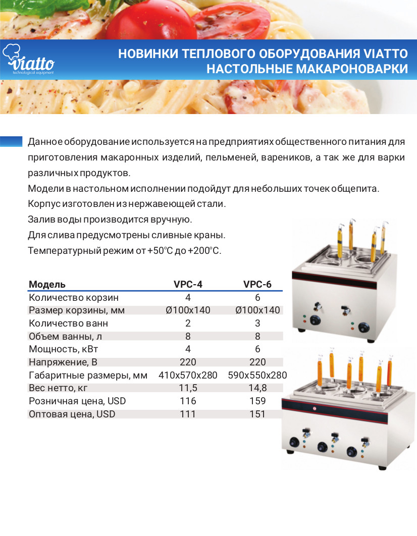 Макароноварка VIATTO VPC-4 используется на предприятиях общественного питания и торговли для варки овощей, всех видов макаронных изделий, гарниров из круп, пельменей и вареников, яиц, морепродуктов и т.д. Корпус выполнен из нержавеющей стали.