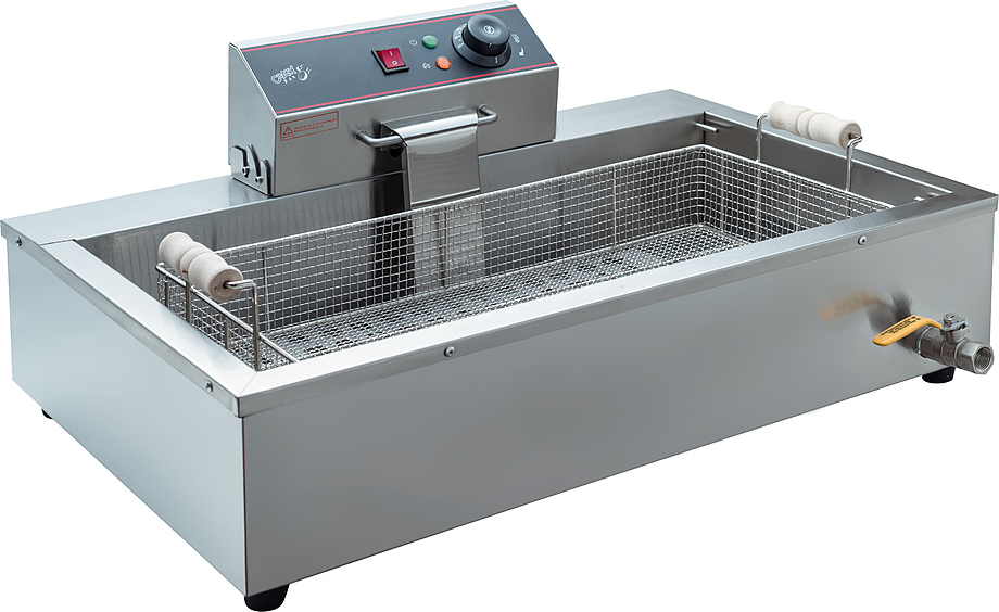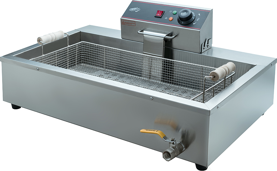 Чебуречница Crazy Pan CP-BEF16 предназначена для приготовления различных продуктов в большом количестве масла на предприятиях общественного питания и торговли. Модель оснащена терморегулятором, боковым поддоном, объемной съемной корзиной и шипцами. Корпус выполнен из нержавеющей стали.