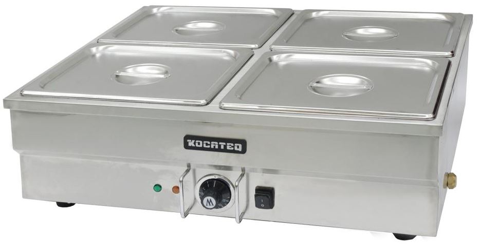 Мармит Kocateq BS4T предназначен для поддержания готовых блюд в горячем виде на предприятиях общественного питания и торговли, в школах и детских садах. Модель оснащена механическим термостатом для регулировки температуры и защитным термостатом, автоматически отключающим напряжение при повреждении основного термостата. Корпус выполнен из нержавеющей стали AISI 304, скобки - из нержавеющей стали.