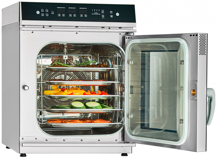 Благодаря небольшим габаритным размерам пароконвектомат подходит для помещений с ограниченным пространством и размещается на столе или подставке.