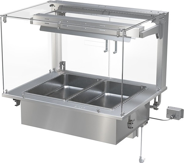 - Сочетание паровой бани под гастроемкостями и верхнего "сухого" нагрева ИК-лампой создает идеальные условия мягкого нагрева, исключая подгорание продуктов, находящихся в гастроемкостях, и одновременно устраняет запотевание стекол витрины